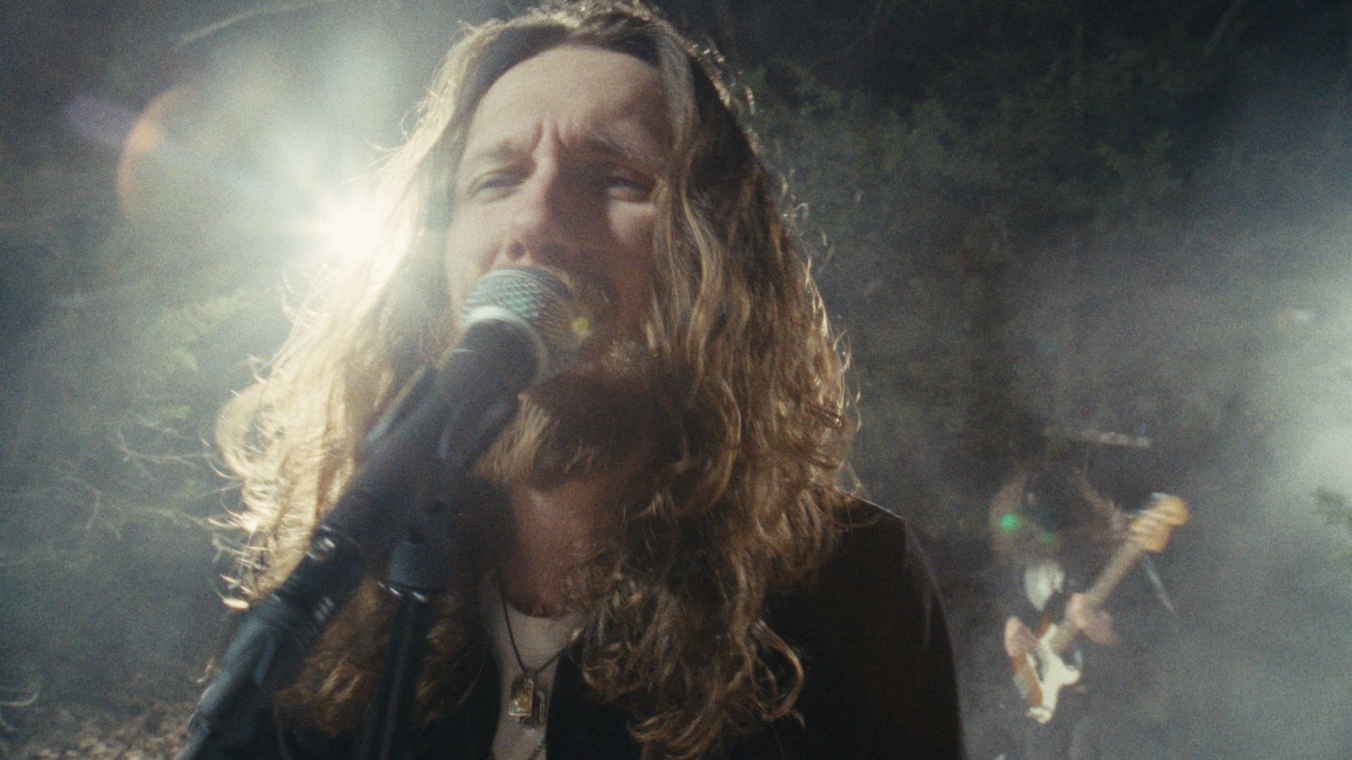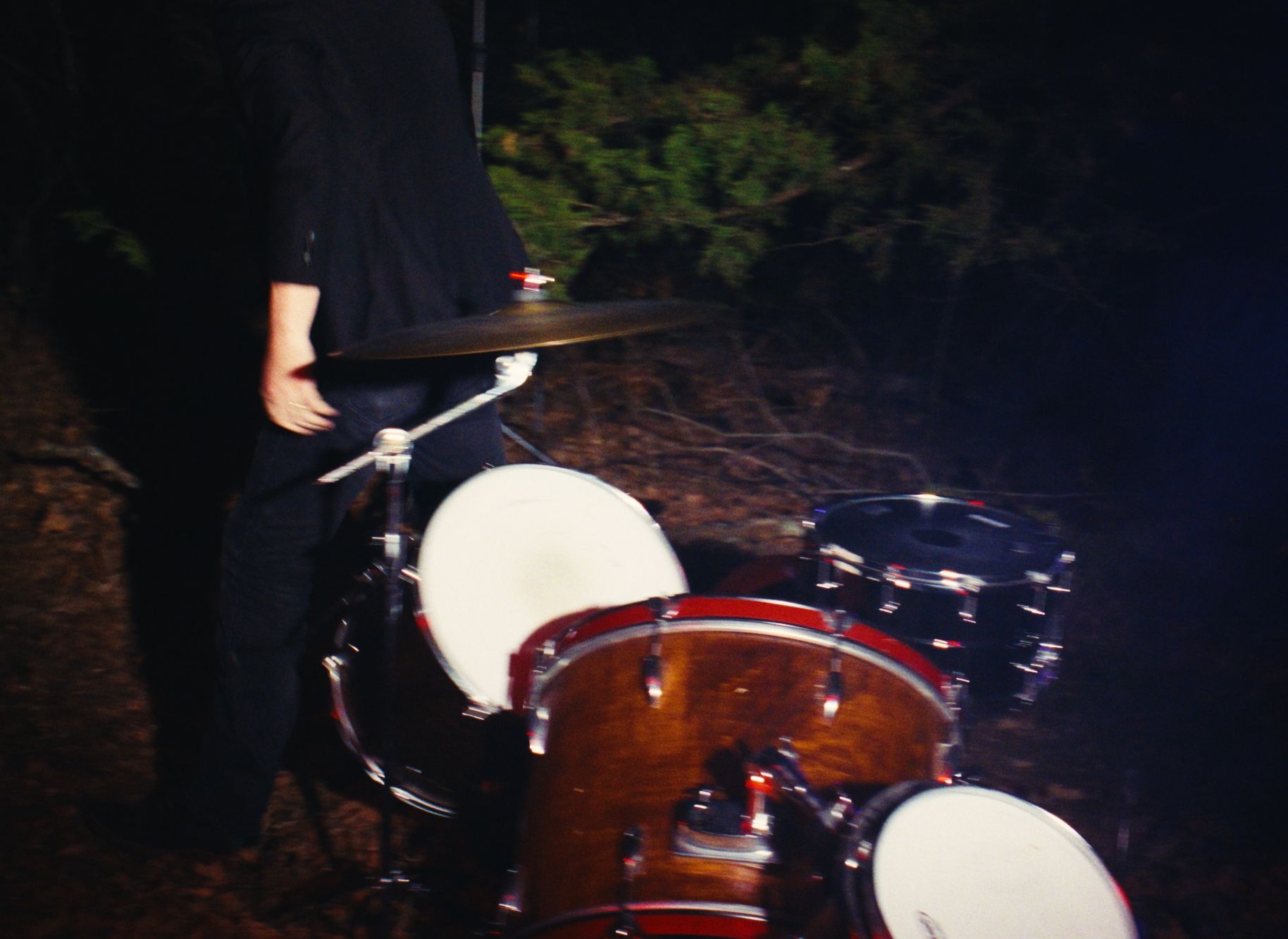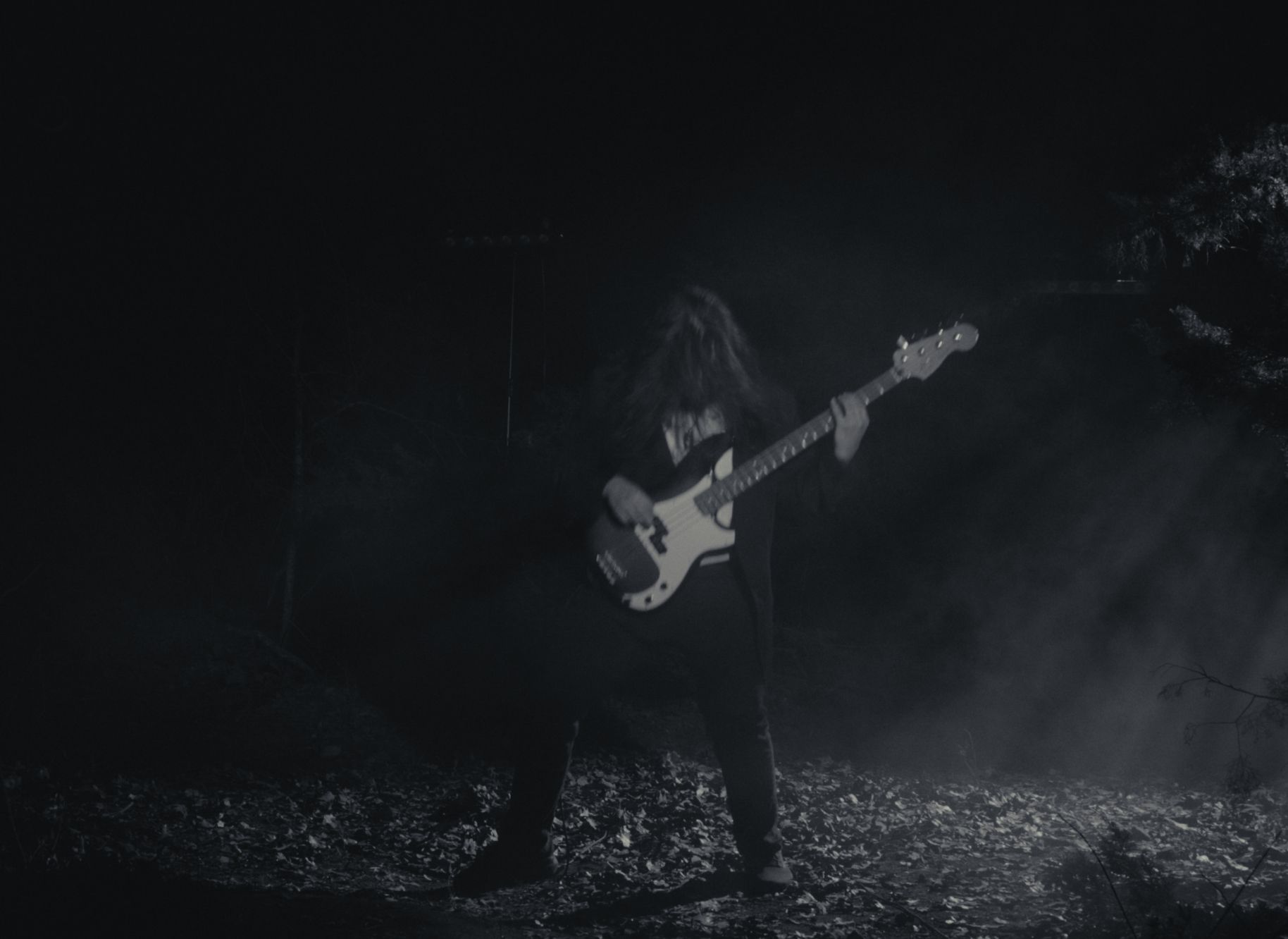 The shoot was built entirely in the woods, after dark, on leaf-covered ground, practical lights punching through smoke, lighting to l cut the dark like something half-remembered. One location. One night. Everything you see was constructed in the trees.